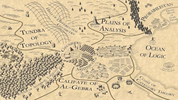 Her şey geometri ve aritmetik ile başladı. O yüzden haritanın merkezinde bu ikisi var. Aritmetiğin yanında, ondan yola çıkılarak üretilmiş “sayılar teorisi tepeleri” ve “Cebir halifeliği”. Geometrinin komşusu “Topoloji tundrası” ; Topoloji ve Cebir arasında ise “Cebirsel Topoloji Ormanları”. Yukarılara doğru, cebir ve topoloji kadar büyük bir alan “Analiz Ovaları”. Analiz ve Topoloji birleşince ortaya çıkan “Diferansiyel Geometri Tepeleri”. Hepsinden tek tek bahsetmeyeceğim tabii ki ama incelenmeye değer ayrıntılarla dolu bir harita olmuş. Cebir’in Arap kökenlerine değinmek için “Cebir Halifeliği” ismini seçmesi, “Fields” yani cisimler için kelimenin diğer anlamını kullanıp tarlalar çizmesi, mantık okyanusunun dışında Gödel’in teoremine yer vermesi gözüme çarpanlardan bazıları.