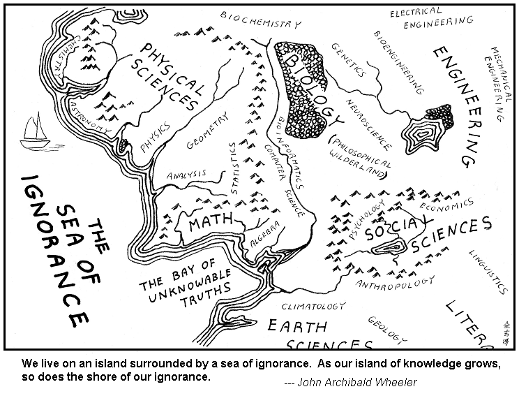 Bilimsel gaflar söz konusu olduğunda, aklıma gelen ilk örnek (her ne kadar şehir efsanesi olma ihtimali olsa da), Amerikan patent dairesi başkanı Charles Duell’in 20. yüzyılın kapısına dayanmışken söylediği “Artık bilimin bulabileceği bir şey kalmadı, bilim, bu noktada tıkandı. Bulabileceğimiz her şeyi bulduk ve bize artık gerek yok.” sözü oluyor. Her kim düşünmüş olursa olsun, günümüzde bunun tam tersi bir durumun içinde olduğumuzu biliyoruz. Kara deliklerin isim babası John Archibald Wheeler’ın da dediği gibi cehalet deniziyle çevrili bir bilgi adasında yaşıyoruz ve bilgi adamız büyüdükçe, cehaletimizin kıyısı da büyüyor. Öğrendiğimiz şeyler arttıkça, bilmediğimiz ne kadar çok şey olduğu ortaya çıkıyor. (“Öğrenecek çok şey var ve bunlar için yeterince zamanım yok” paniğine kapılmayıp, “ben zaten hey şeyi biliyorum ki yhaa” gibi semptomlar gösteriyorsanız sizleri David Dunning ve Justin Kruger‘a emanet edip yolumuza devam edelim.) Yukarıdaki haritada cahillik denizi kıyısı boyunca ilerlerken hemen sağımızda kalan matematiğe odaklanalım ve Martin Kuppe (Nam-ı diğer ZoggTheAlien) tarafından çizilen Mathematistan haritasına bir göz gezdirelim.