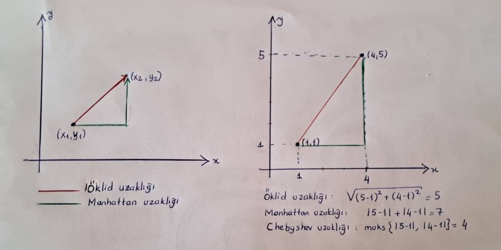 Bu soyut mesafe ölçme yeteneği, veri bilimi ve makine öğrenmesi gibi modern alanlar için de temel bir araç haline gelmiştir. Bu alanlarda amaç genellikle, verilerin temsil edildiği özellik uzaylarındaki (feature spaces) noktalar arasındaki benzerliği veya farklılığı nicel olarak ölçmektir. Sınıflandırma veya kümeleme gibi pek çok algoritmik görev, bu uzaylarda tanımlanan Öklid mesafesi (düz çizgi uzaklığı) veya Manhattan mesafesi (şehir blokları gibi dik açılı hareket) gibi çeşitli metrikleri kullanarak noktaların birbirine ne kadar yakın ya da uzak olduğunu hesaplamaya dayanır. Dolayısıyla metrik uzay yapısı, veriler arasındaki ilişkileri anlamak ve buna dayalı algoritmik kararlar vermek için gereken matematiksel çerçeveyi de sunmaktadır.
